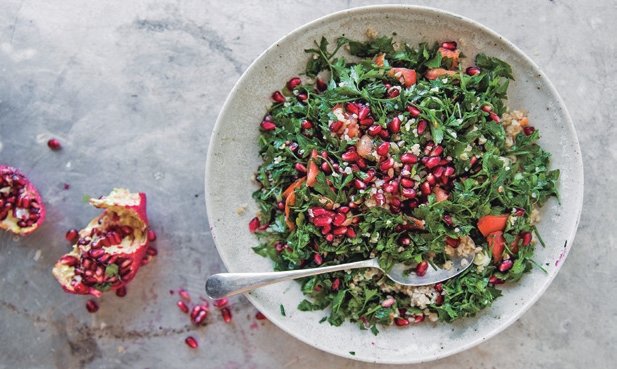 Ensalada libanesa de perejil, tomate, cebolleta, sémola y un toque cítrico de limón.