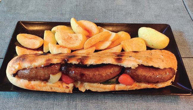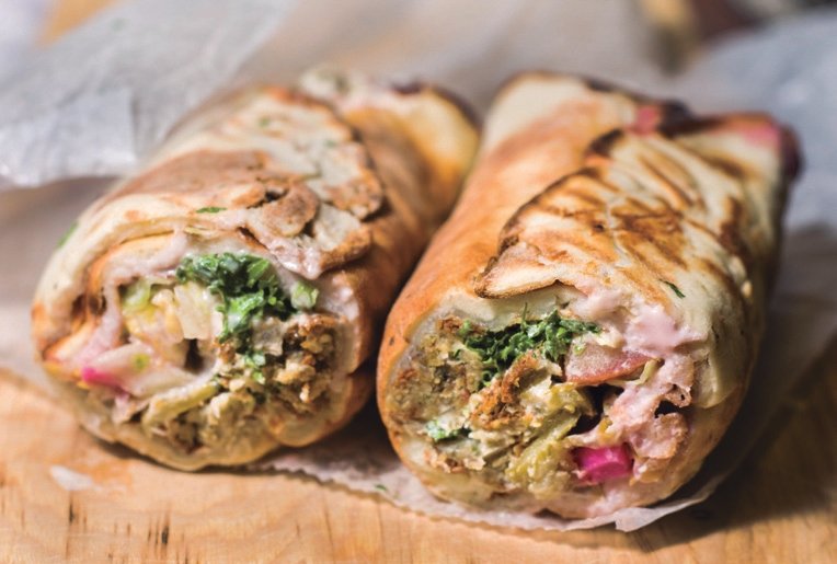 Relleno de jugoso pollo a la brasa deshuesado, pepinillos, salsa de ajo Y salsa especial Shukran.